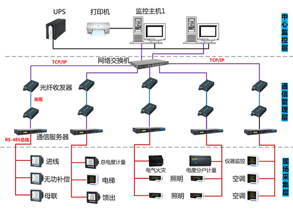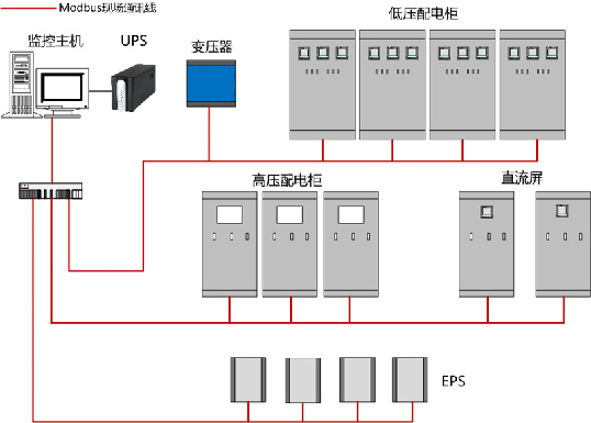 配电室中通常设置两台变压器、不间断电源EPS、UPS、直流屏和高、低压配电柜若干面。通常在配电柜上配置电力仪表进行终端数据采集。