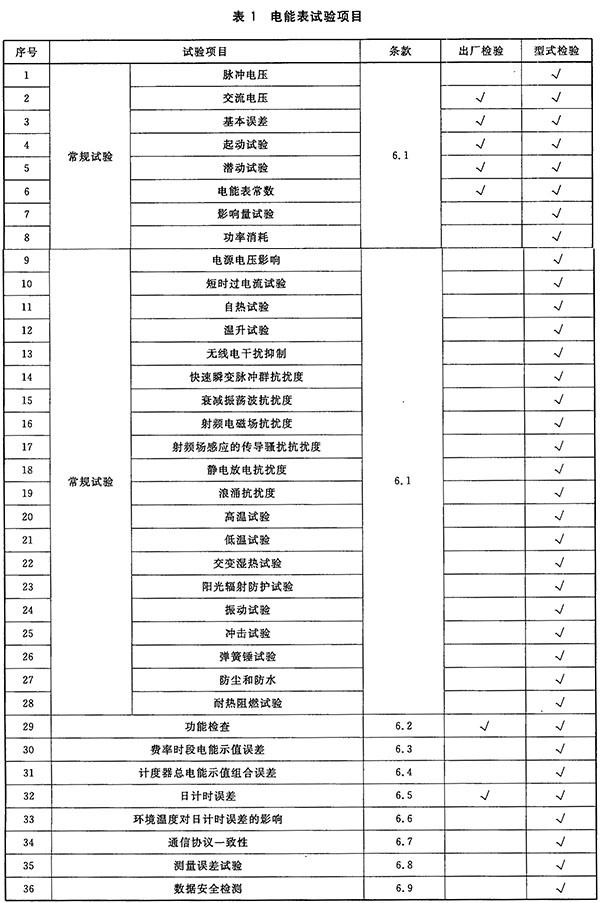 每个电能表按照本标准的试验方法进行检验,检验合格后应施加出厂封印,并出具质量合格证明,试验项目见表1。
