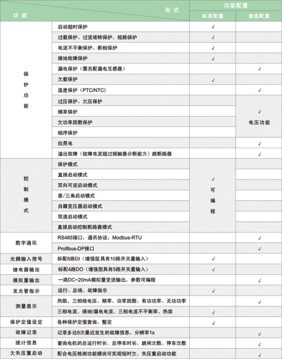 • 通过监测电动机三相回路的电流、电压等参数对电动机进行全面保护(具有启动时超时、过载、堵转、断相、不平衡、接地故障、漏电、短路、欠载、超温、过压、欠压、频率、欠功率因数、相序错乱等多种保护功能,可对电动机进行全面的保护并可选“抗晃电”功能和欠、失压重启功能)